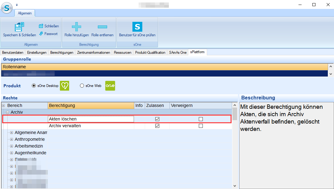 Hinweis: Die neue Berechtigung "Akten löschen" hat Auswirken auf die Kachel "Archiv" in sOne Desktop. Die dazugehörige Funktion entnehmen Sie bitte dem Artikel: "Neue Kachel Archiv, Akteneinlagerung und Aktenverfall"