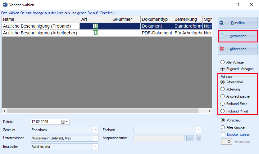 Wenn Sie im Fenster Vorlage wählen die Funktion Versenden nutzen, so wird nun auf die seitliche Auswahl im Bereich Adresse geprüft: