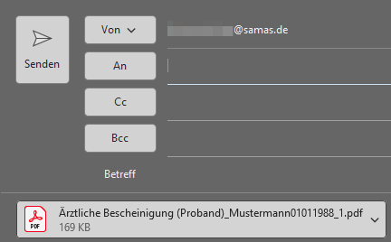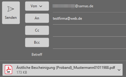 Wenn, je nach Auswahl, bei Arbeitgeber, Abteilung, Ansprechpartner, Proband Firma oder Proband Privat eine E-Mailadresse hinterlegt ist, so wird diese direkt an Outlook übergeben. Wurde keine E-Mailadresse hinterlegt, so bleibt das Feld An in Outlook weiterhin leer.