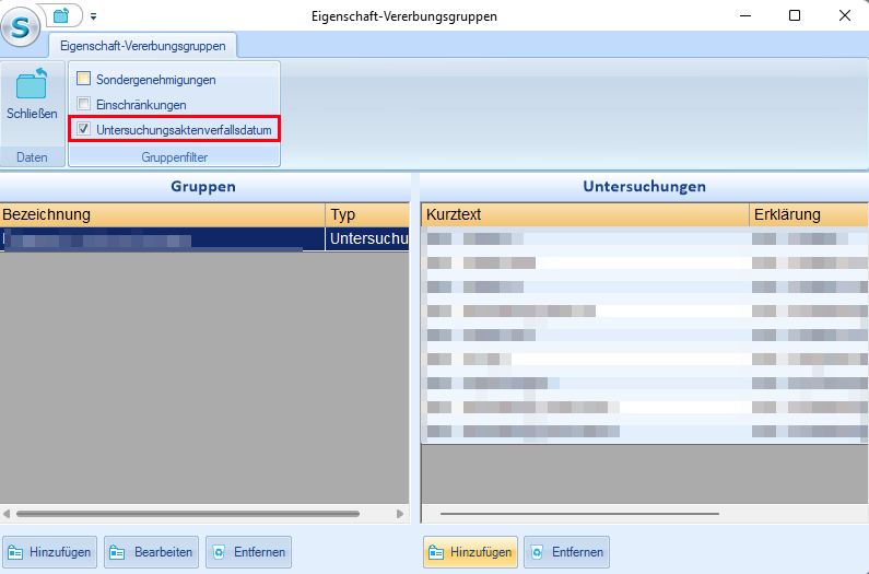 Nur in SAmAs.one verfügbar.Die Standardtabelle Eigenschaften-Vererbungsgruppen (zu finden unter Daten -> Standardtabellen -> Untersuchungen) wurde um die Option Untersuchungsaktenverfallsdatum erweitert. Wenn Sie die Option anwählen, werden Ihnen die entsprechenden Gruppen, welche über diese Eigenschaft verfügen, mit angezeigt.