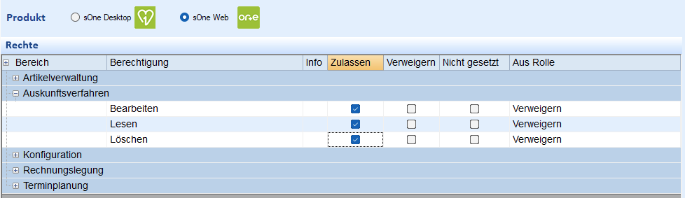 Nur in Kombination mit der sPlattform möglich!Die sOne Web Benutzerberechtigungen wurden um den Bereich Auskunftsverfahren erweitert.