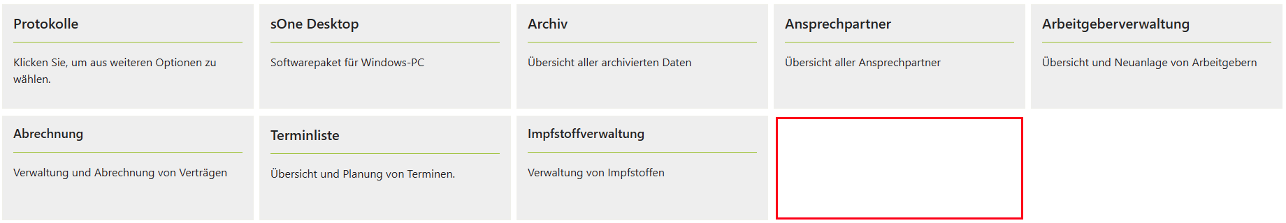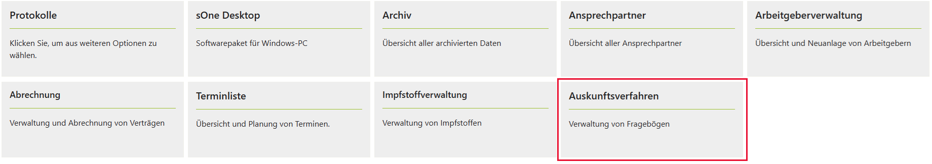 Ist die Berechtigung auf Zulassen, so wird dem Benutzer die Kachel Auskunftsverfahren in sOne Web angezeigt. Der Benutzer kann die Fragebögen einsehen, aber nicht bearbeiten oder löschen.