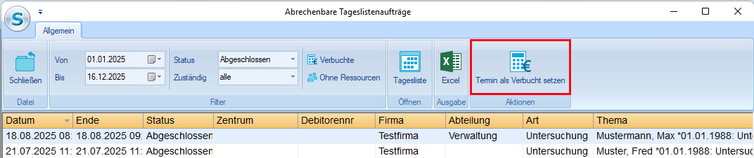 Weitere Informationen zur Funktion können Sie folgendem Artikel entnehmen: Termine können jetzt direkt aus der Liste der abrechenbaren Tageslistenaufträge als „verbucht“ gekennzeichnet werdenInterne ID: 18503 / Feature: 18255