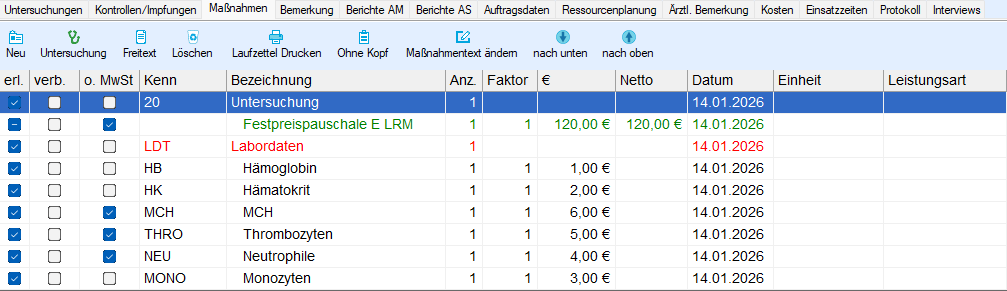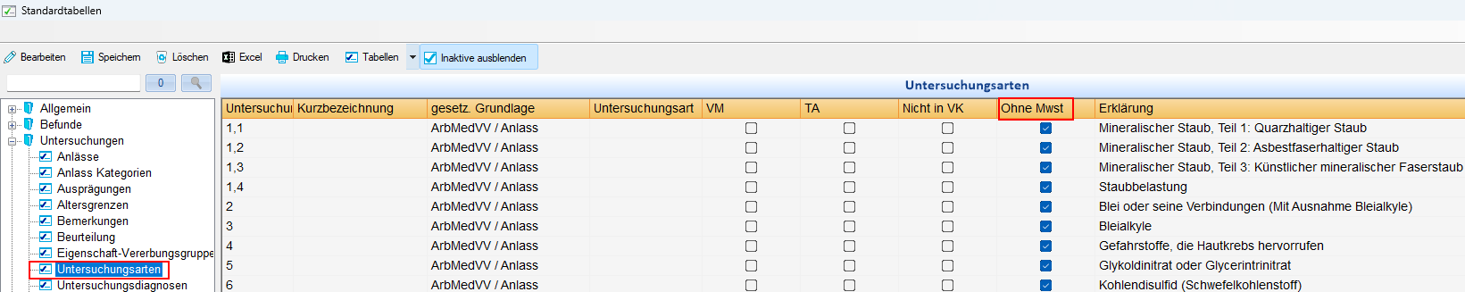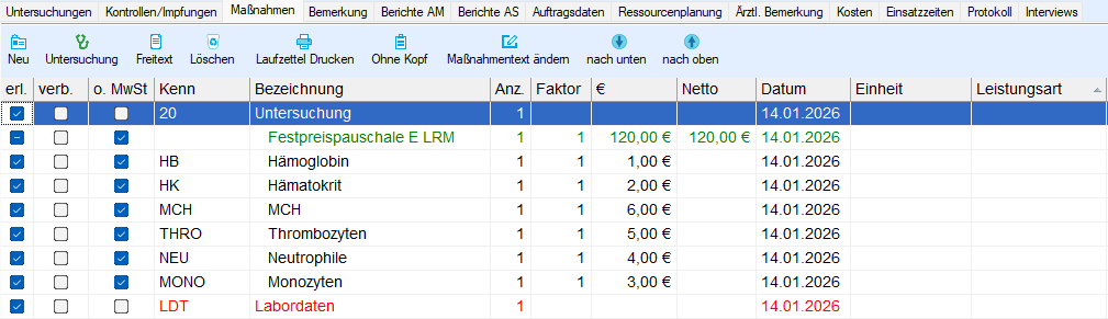 Sind alle aktivierten Untersuchungen gemäß den Standardtabellen als „ohne MwSt.“ gekennzeichnet: