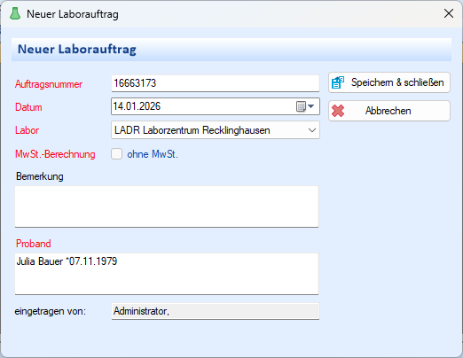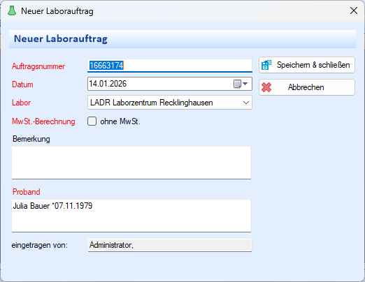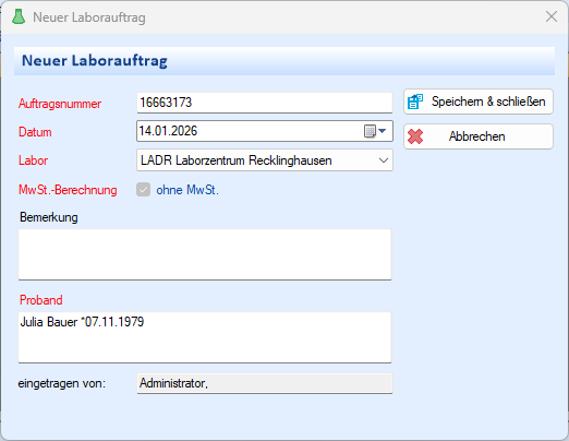 • Der Laborauftrag wird automatisch ohne MwSt. angelegt.
