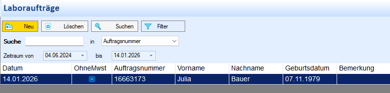 In der Übersichtsliste der Laboraufträge wird zusätzlich eine Spalte angezeigt „Ohne MwSt.“